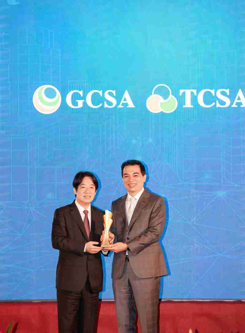 达全方位永续表现获全球永续奖及台湾永续奖肯定,,,,由副总统赖清德颁奖 (左),,,,龙门国际总经理柯富仁 (右) 代表领奖