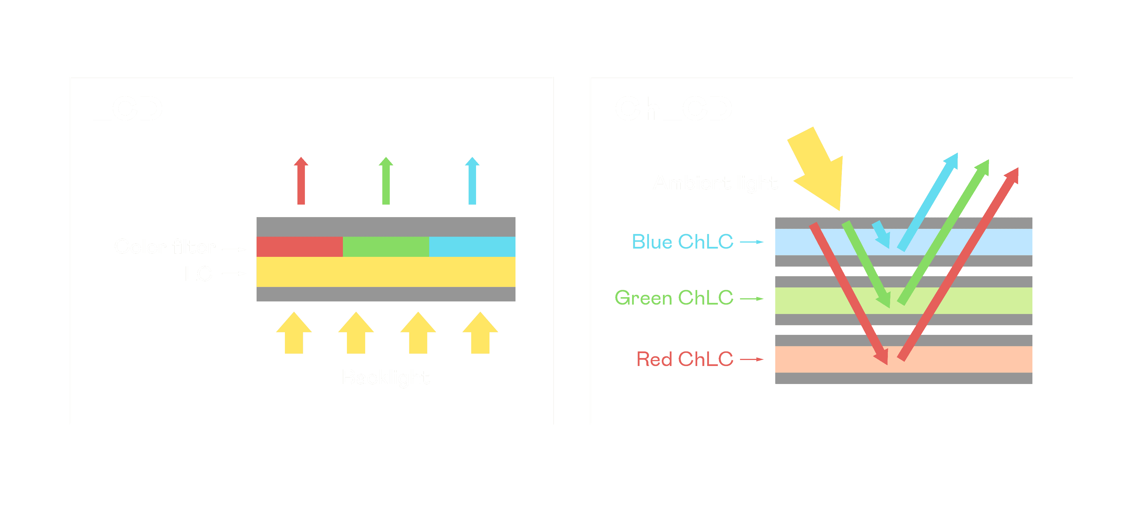 ChLCD 胆固醇液晶就如同纸张一样,,,,透过反射环境光来显示影像,,,,因此长时间观看不易造成人眼视觉疲劳,,,可达到护眼效果。。。当处于户外阳光下使用,,,,LCD 影像容易失真而不易观看,,,,但胆固醇液晶仍可维持较佳的影像品质。。。